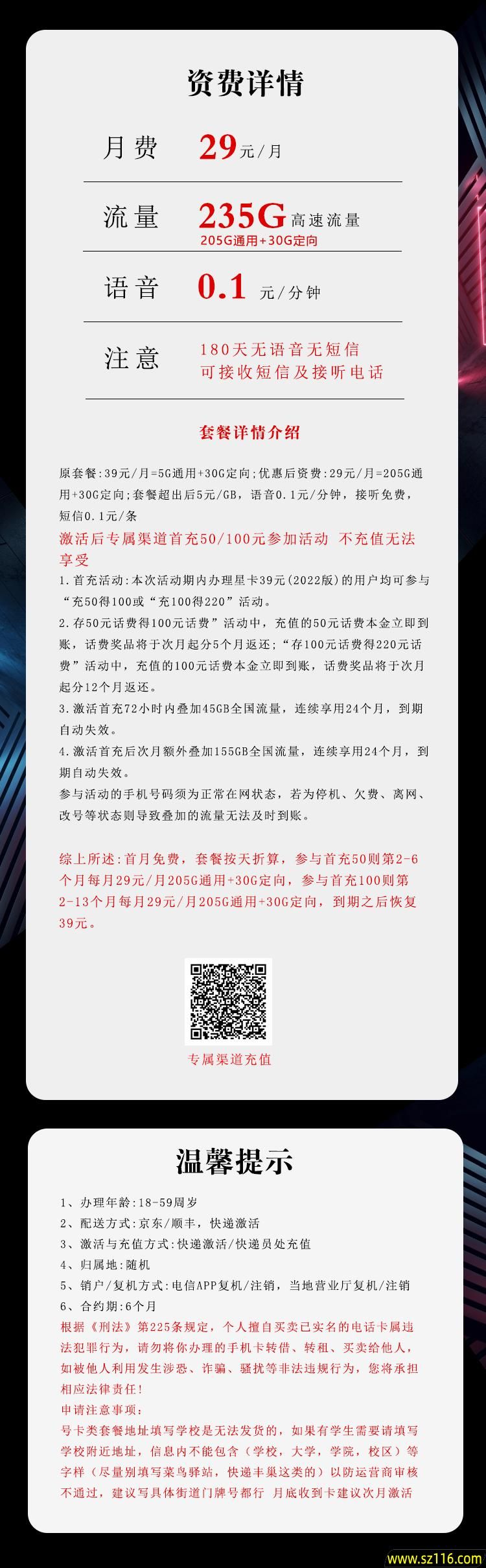 正文 电信飞螺卡 29元235G 18-59周岁 栓卡网 V管理员 /11-15 /97 阅读 1115 电信飞螺卡套餐资费,电信飞螺卡 套餐图介绍,电信飞螺卡 办理入口本文底部↓温馨提示:号卡资料可能会随运营商政策而变动,具体资料以下单页为准,此页面仅供展示,非下单页面。微信扫码办理: 申请办理注意事项: 1、下单时请务必确保办卡人、收件人姓名一致,身份证号码、手机号码正确,切勿写大致范围,勿填菜鸟驿站,否则无法配送 2、手机卡仅限本人领取认证激活,禁止转售、帮助他人代替实名制等违法犯罪行为 3、所有的卡请按照运营商要求首充话费激活,否则流量不到账!