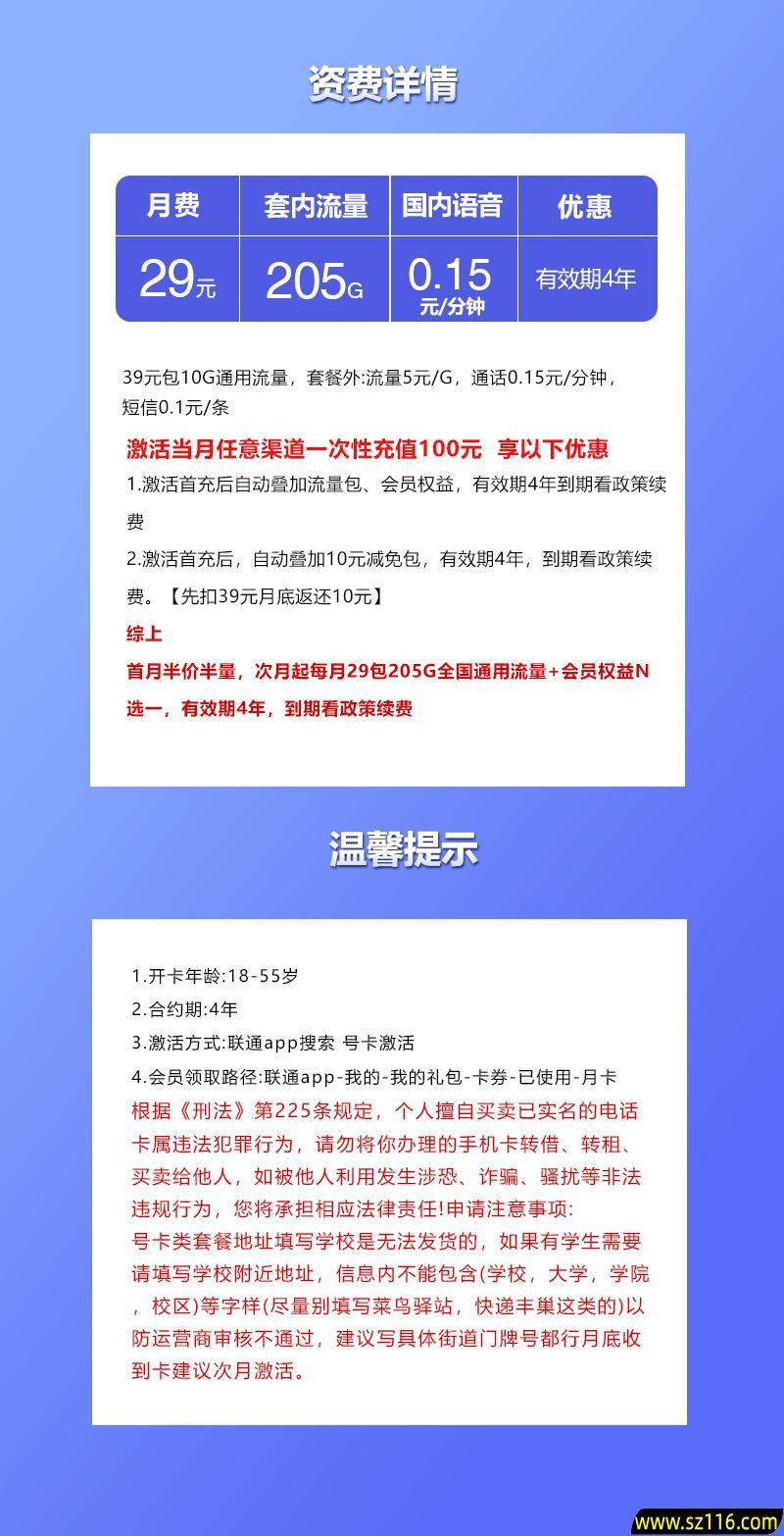 正文 联通飞涵卡 29元205G+会员权益 18-55周岁 栓卡网 V管理员 /11-14 /94 阅读 1114 联通飞涵卡 套餐资费,联通飞涵卡 套餐图介绍,联通飞涵卡 办理入口本文底部↓温馨提示:号卡资料可能会随运营商政策而变动,具体资料以下单页为准,此页面仅供展示,非下单页面。微信扫码办理: 申请办理注意事项: 1、下单时请务必确保办卡人、收件人姓名一致,身份证号码、手机号码正确,切勿写大致范围,勿填菜鸟驿站,否则无法配送 2、手机卡仅限本人领取认证激活,禁止转售、帮助他人代替实名制等违法犯罪行为 3、所有的卡请按照运营商要求首充话费激活,否则流量不到账!