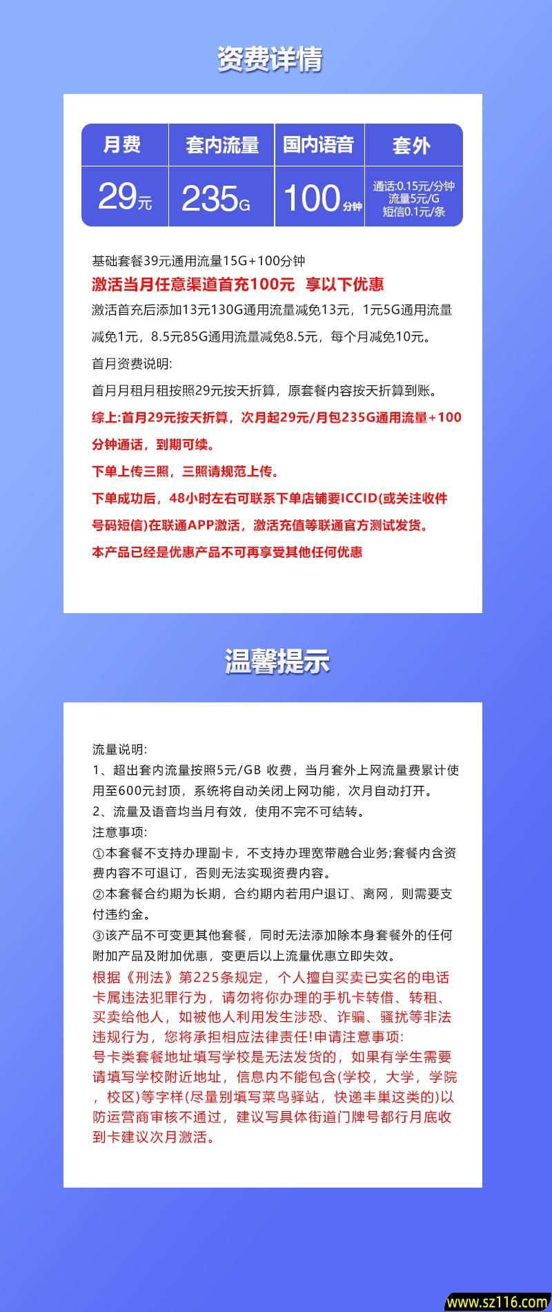 正文 联通飞莎卡 29元235G+100分钟 18-65周岁 栓卡网 V管理员 /11-18 /86 阅读 1118 联通飞莎卡套餐资费,联通飞莎卡 套餐图介绍,联通飞莎卡 办理入口本文底部↓温馨提示:号卡资料可能会随运营商政策而变动,具体资料以下单页为准,此页面仅供展示,非下单页面。微信扫码办理: 申请办理注意事项: 1、下单时请务必确保办卡人、收件人姓名一致,身份证号码、手机号码正确,切勿写大致范围,勿填菜鸟驿站,否则无法配送 2、手机卡仅限本人领取认证激活,禁止转售、帮助他人代替实名制等违法犯罪行为 3、所有的卡请按照运营商要求首充话费激活,否则流量不到账!