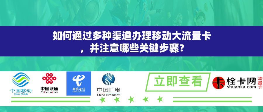 办理移动大流量卡需要根据自己的需求选择合适的渠道和套餐,并注意查看合约期和优惠活动等信息,在使用过程中要注意规范使用避免产生额外费用,如有无法解决的问题可及时联系客服寻求帮助。