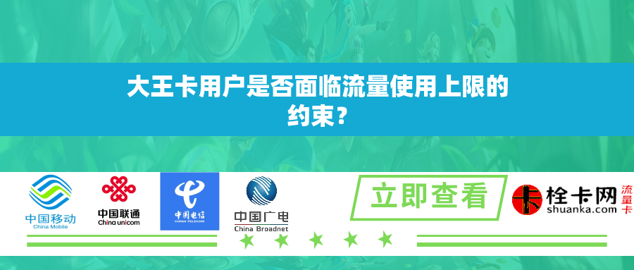 流量使用限制1、月度流量封顶:大王卡的月度流量上限为40GB,当月累计使用达到40GB后,系统会自动关闭上网功能,次月自动恢复,但用户可以通过申请解除40GB封顶限制来继续使用流量,超过40GB的流量将按套餐外资费计费。