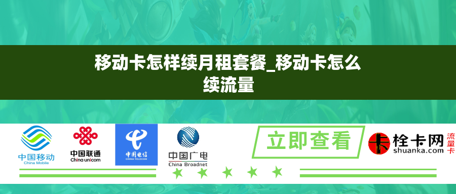 一、移动卡如何续月租套餐移动卡的月租套餐续费可以通过多种方式进行,下面将介绍几种常见的方法: