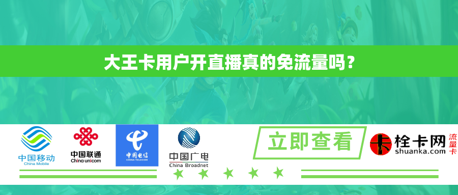 2、主播直播:如果你是主播并使用大王卡进行直播,那么直播过程中产生的流量(包括上传视频、文字、图片等)并不属于免流范围,这意味着,如果你使用大王卡作为主播进行直播,将会消耗你的套餐内流量或产生额外的流量费用。